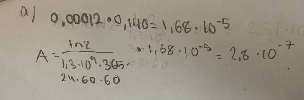 Vad är det för uppställning du gjort? Den är inte lätt att följa, särskilt inte utan enheter. Det blir svårt att följa och enheter är jättebra som kontroll. Fråga (a) rör aktivitet, så jag gissar svaret skall vara i becquerel (Bq) (sönderfall per sekund). Får man inte ihop rätt enhet, så har man helt enkelt inte räknat på rätt sätt.