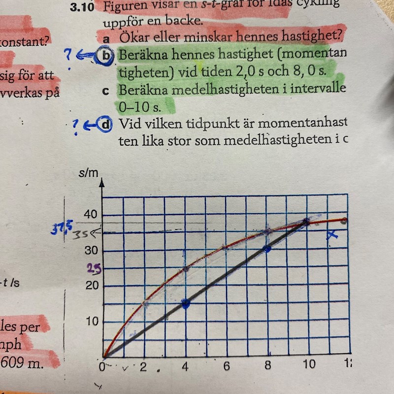Yngve skrev:Hastigheten vid en viss tidpunkt är lika med lutningen på s/t-grafen vid just den tidpunkten.