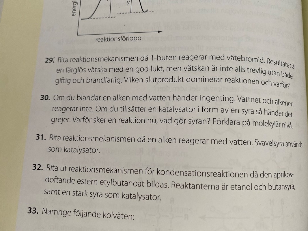 Nope, men det är en syra. Alkenen plockar upp ett väte och blir positivt laddat. Vatten kan då funka som en bättre nukleofil. Det är därför man pratar om "syrakatalys". Tycker svaret på 30 är rätt bra, vad exakt är det du inte är med på?