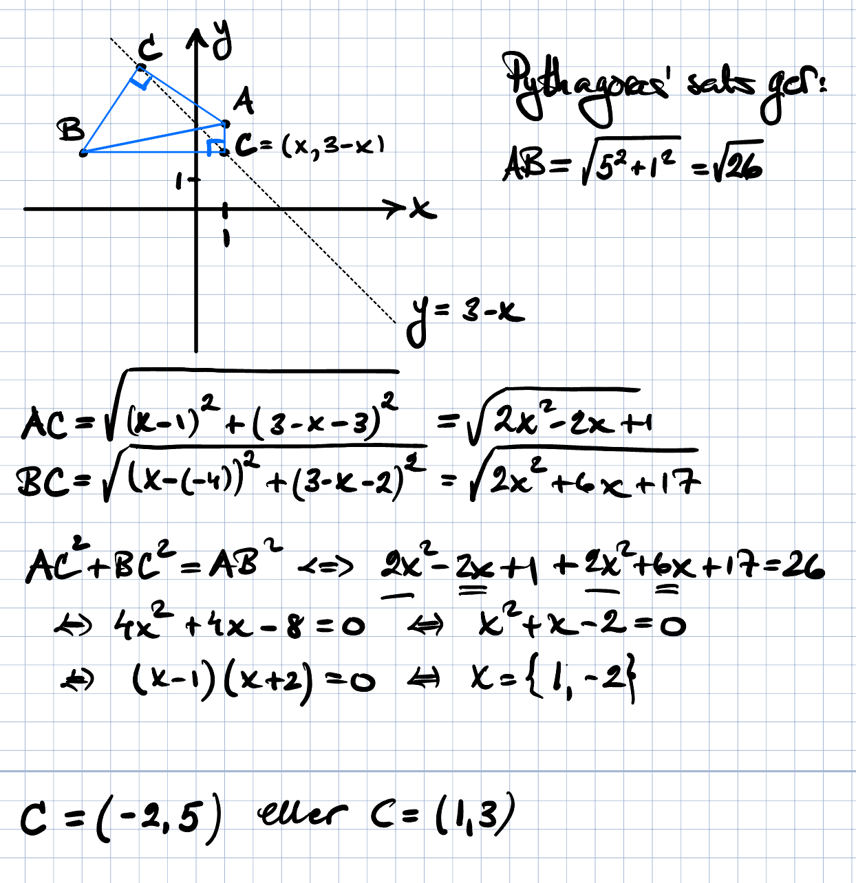 I den rätvinkliga triangeln ABC ligger hypotenusans ändpunkter i A = (1, 3) och i B = (-4, 2). Bestäm vart hörnet C ska finnas om det ligger på linjen y= 3-x?