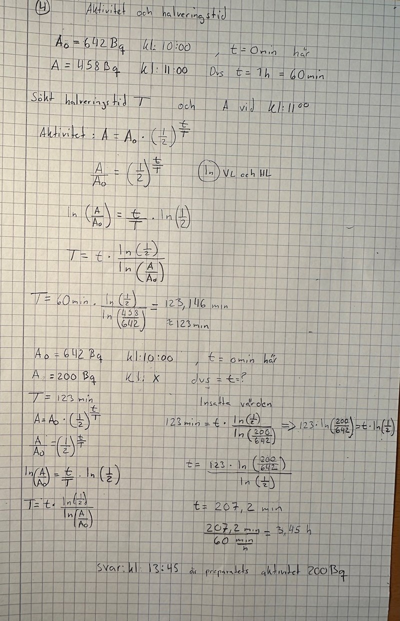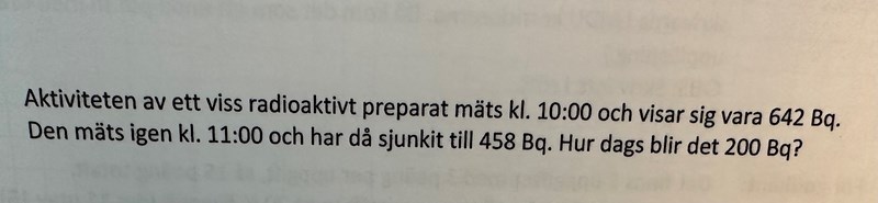 Så det blir strax innan halv två att aktiviteten är 200 Bq.