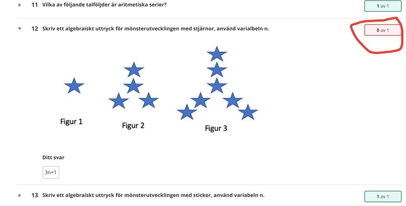 Jag har omtenta i matte 3 på Stockholms för grundlärare f-3, i vår portal kna man göra matte test där denna stjärnuppgift är med som test.. Jag har vid ett tillfälle skrivit att svaren är 3n+1 men i resultatet står det att det är ett felaktigt svar. Därav min förvirring :/