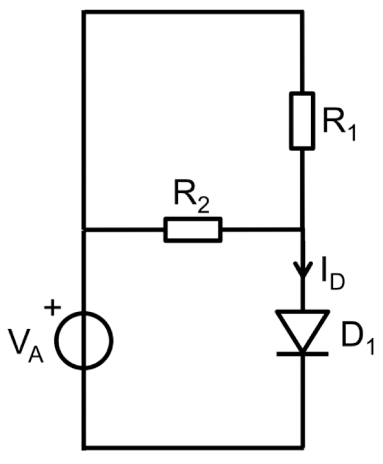 Jag behöver hjälp med en uppgift och lite generell vägledning i hur man kan gå tillväga för att analysera kretsar med dioder. Jag har följande krets där jag vill beräkna ID och värdena på R1, R2, VA samt VF (tröskelvärde för dioden) är givna.