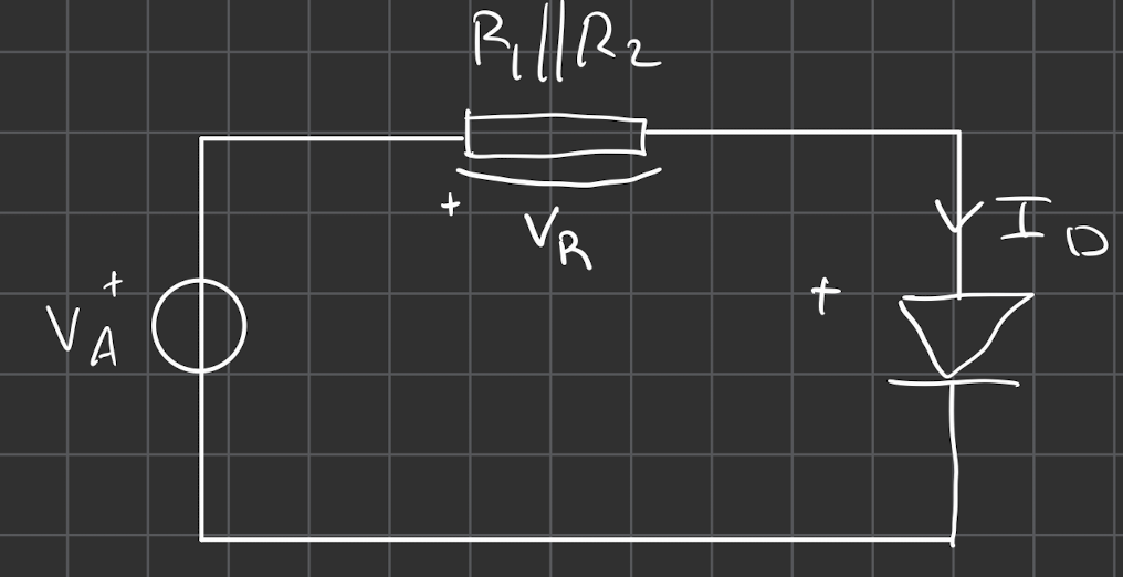 Hur får du fram denna formel? Jag ser att R1 och R2 sitter parallellt och att man då kan förenkla det till en krets med tre komponenter. Med Ohms lag får jag för resistorn att . Hur ser du att VR = VA? Finns det ingen spänning över dioden som man bör räkna med?