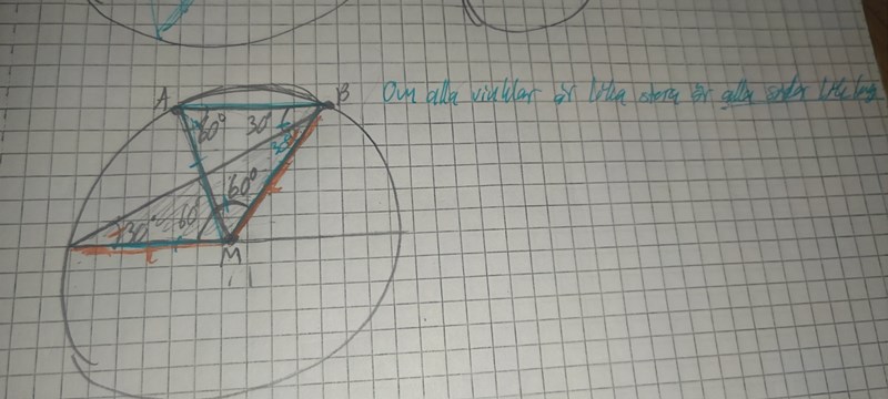 jag började med att rita två streckor från m till a och från m till B då vet jag att de är lika långa eftersom bägge är radien och går från mittpunkten till cirkels Strand så eftersom de är lika stora så blir vinklarna lika stora på dem och då får jag en triangel som jag har markerat med blå färg Triangeln MBA men jag får också en annan likhetstriangel som går från vänster till m från den punkten till B och sedan tillbaka till m och eftersom jag vet att en vinkel är 30 så måste den andra också vara 30 och den andra ingår i den blå Triangelnså tänkte jag för någon anledning att det måste vara hälften så att hela din Kent blir 60 men jag tror inte jag får göra så på prov fall eftersom jag måste veta varför jag antog att resten skulle vara 30 det kan lika gärna vara 31 eller något sånt men så jag undrar om det är rätt eller inte men i alla fall om vi antar och går på scenariumet att det var 30 så blir så blir det en likb liksidig triangel eftersom alla vinklar är lika stora och om alla vinklar är lika stora som måste alla sätt beror var lika stora därför att sträcka AB lika stor som radien men är osäker