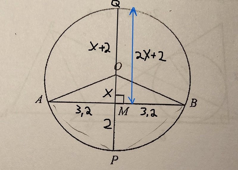 Ja, jag gjorde det... x gånger 2 = 3,2 gånger 3,2, men svaret blir inte rimligt tycker jag. Höjden (OM) kan inte bli större än PM (2)... Vad gör jag för fel?