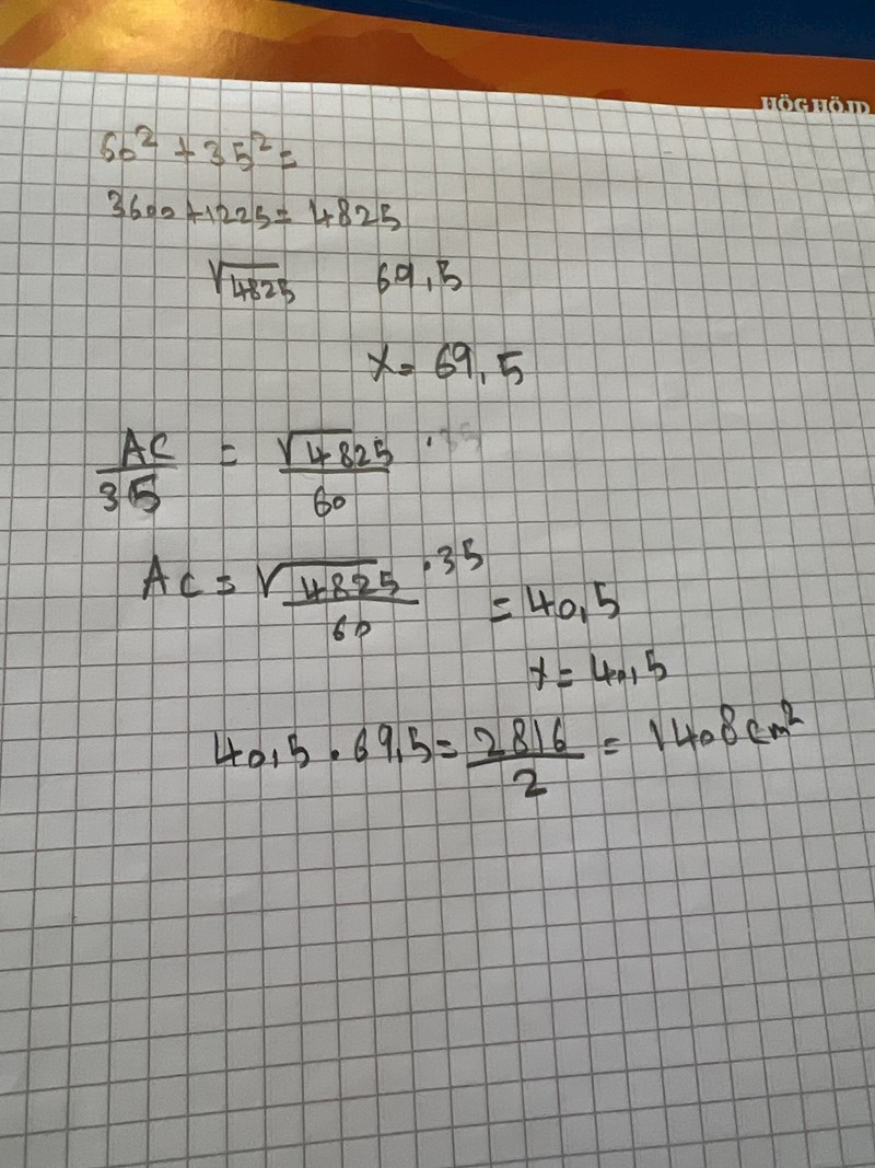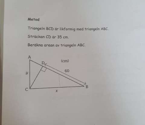 Sidan x (d.v.s. BC) är hypotenusan i den rätvinkliga triangeln BCD vars kateter är givna (|CD| är 35cm och |BD| är 60cm). Den kan alltså beräknas m.h.a. Pythagoras sats.