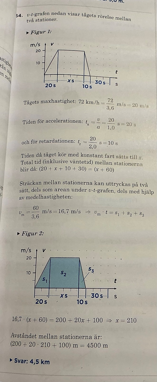Ett tunnelbanetåg accelererar från start med 1,0 m/s2 tills tåget når sinmaxhastighet 72 km/h. Tåget bromsar in vid varje station medaccelerationen 2,0 m/s2. Vid varje station väntar tåget i 30 s. Vi antar att detär samma avstånd mellan alla stationer längs linjen.Hur långt avstånd är det mellan stationerna om man vet att tunnelbanetågetkör mellan sina ändstationer med en medelhastighet på 60 km/h?