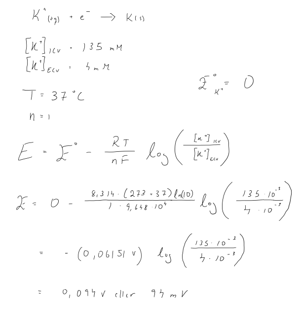 FRÅGA: En viktig elektrolyt i hjärtats arbete är kaliumjoner vars koncentration är olika i intracellulär vätska (ICV), typiskt [K+]ICV =135 mM, och utanför hjärtmuskelceller i den extracellulär vätska (ECV), typiskt [K+]ECV = 4 mM. Beräkna cellpotentialen vid 37 °C som genereras av ovan nämnda skillnad i koncentration av kaliumjoner. Kommentera vad ditt beräkningsresultat visar om arbetet som krävs eller utvinns för att göra kaliumjonernas koncentration större i den intracellulära vätskan