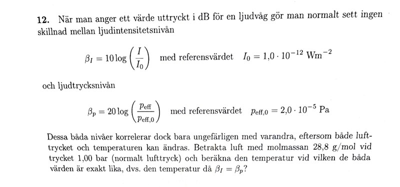 Men akustiska impedansen är väl alltid Z=pv? Du räknar inte med trycket i nämnaren? Vi vet att Z kan skrivas som p*v där v är lika med sqrt(gamma*RT/M) och det är ju T vi ska lösa ut. Jag får inte till 300 K