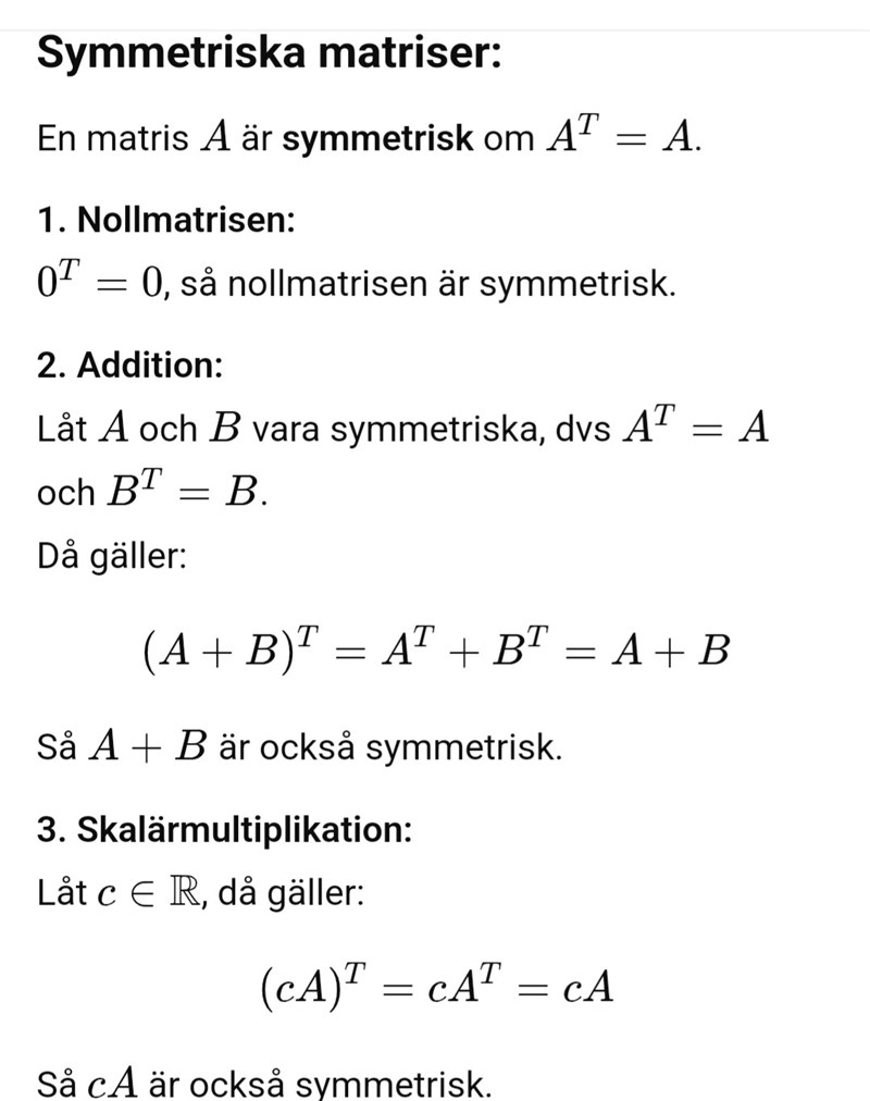 Z = , dvs mängden av symmetriska matriser, är ett underrum till . Visa det, om det inte uppenbart.