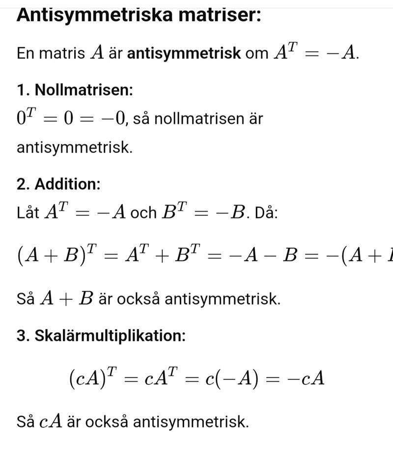 W = , dvs mängden av antisymmetriska matriser, är ett underrum till . Visa det, om det inte uppenbart.