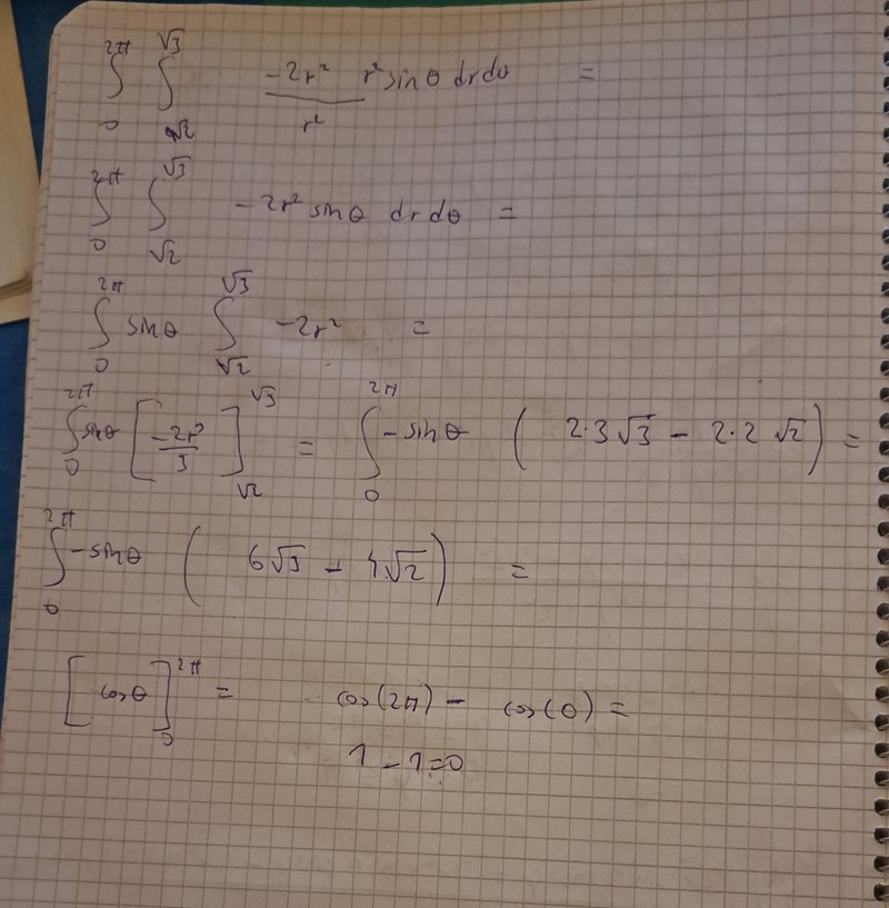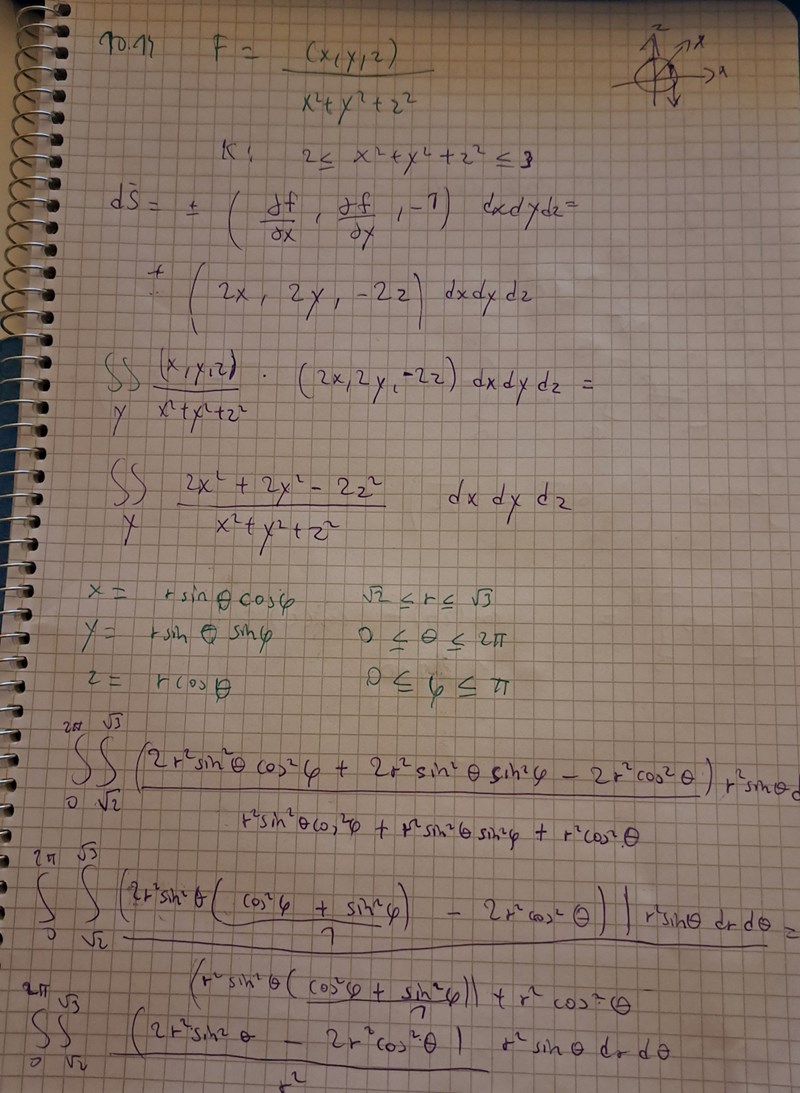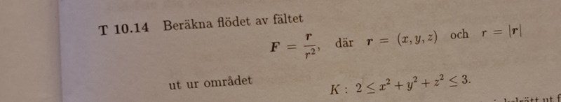 Grejen är den att jag vill räkna på radierna sqrt(3) och sqrt(2) och det är utan att använda divergenssatsen. Nej jag använder ingen volym här. Detta är vanlig dubbelintegral som kanske bara gjordes på fel sätt . Hur menar du med begränsningsyta en i taget ? Så flödet ut ur området är då r=sqrt(3) och ut ur området r=sqrt(2)? Hur resonerar man med tecknet?