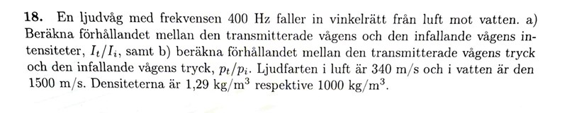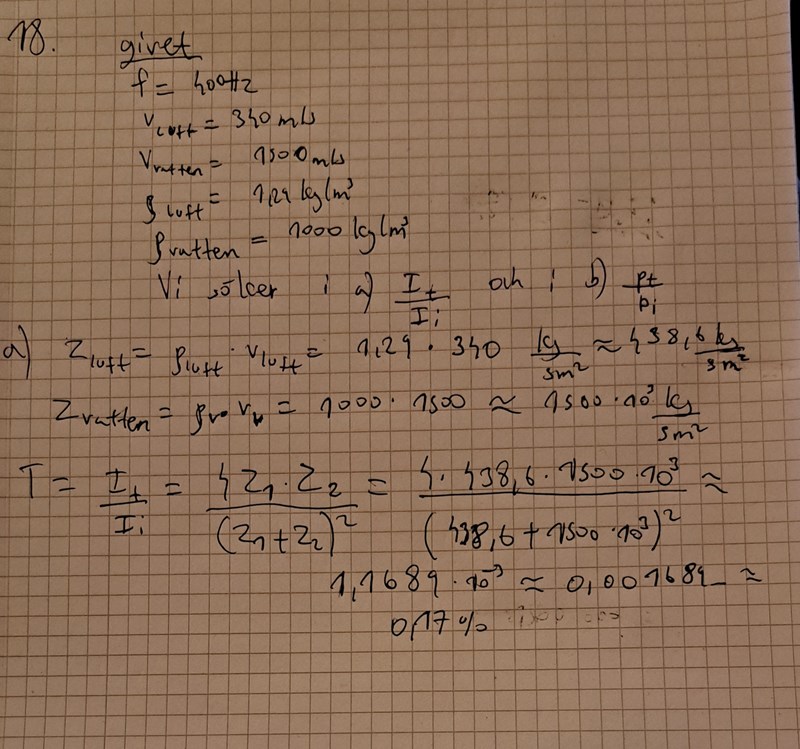 Facit fick 0.0012 i a) uppgiften då de räknade ut reflektionkoefficienten medan jag räknade ut transmissionskoefficienten då den ges som T=4*Z1*Z2/(Z1+Z2)^2. Jag förstår inte varför man inte kan använda den formeln för att komma fram till samma svar?