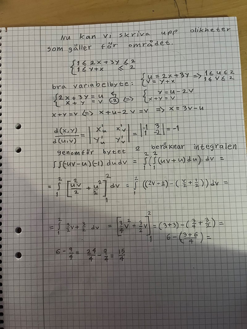 Så på så sätt fick jag fram vad som verkade vara ett bra variabelbyte, nämligen u = 2x + 3y och v = x +y, med de nya gränserna 1<u<2 och 1<v<2. Så jag beräknade funktionaldeterminanten för variabelbytet och genomförde variabelbytet, och kom fram till att integralen är 15/4. Vilket är fel. Är min metod helt fel, eller räknar jag bara fel någonstans?