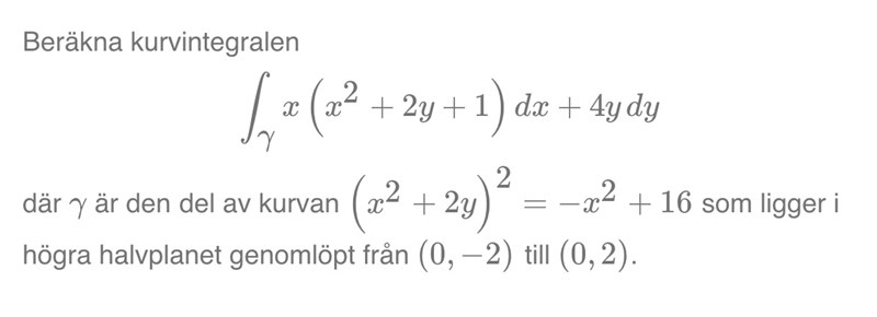 Här är en annan idé... där kurvintegralen beräknas direkt m.h.a. en parametrisering av kurvan. Jag kom på denna parametrisering då variabelbytet i mitt förra inlägg ledde till en halvcirkel i högra halvplanet med radien 4 och mittpunkten i origo.