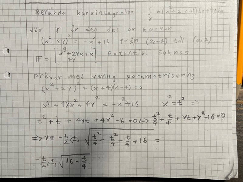 Så det enda som återstår är då parametrisering antar jag, men jag lyckas inte hitta en bra parametrisering. Jag har försökt med x = t men då blir uttrycket för y väldigt krånligt men jag kan inte komma på någon annan parametrisering.