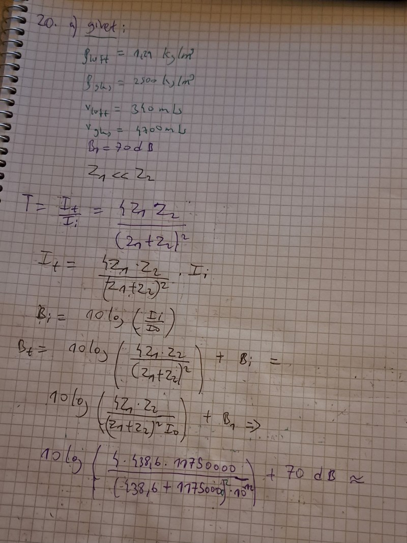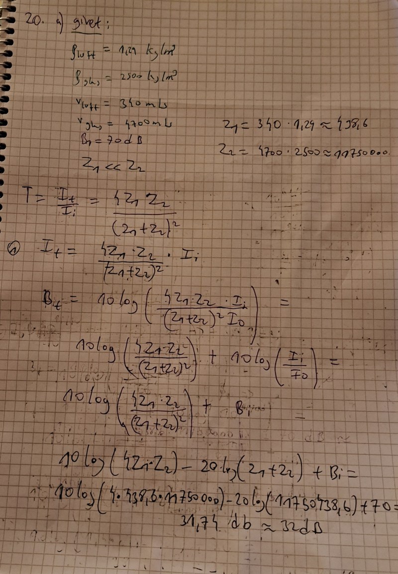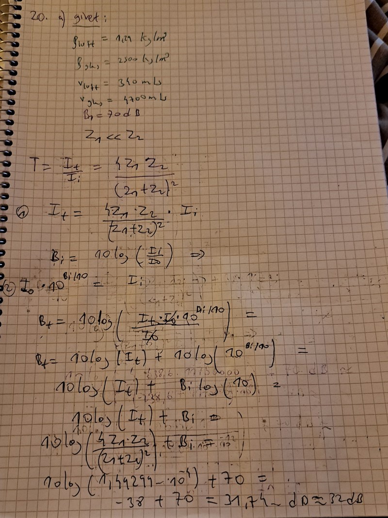 Ja jag får -38 db när jag 10log(4Z_luft/Zglas). Lägger man sen till 70 dB så är det 32 dB som svar.