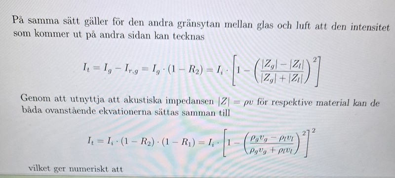 Pieter Kuiper skrev:destiny99 skrev:Pieter Kuiper skrev:destiny99 skrev:Pieter Kuiper skrev:destiny99 skrev:Varför är det bättre att räkna med transmissionskoefficient formeln än reflektionskoefficienten ? Jag tänker vi är ändå ute efter den reflekterade och transmistterade intensitet så att vi kan även få fram ljudintensitetsnivå