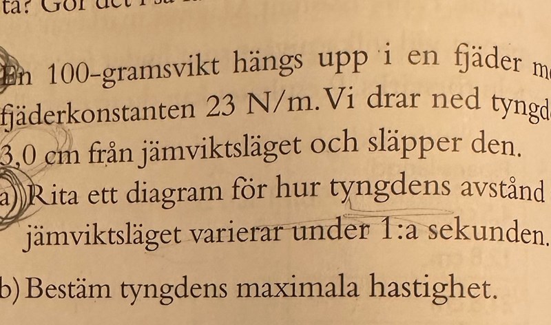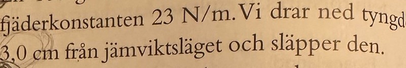 Tyngden hänger i jämviktsläget. Sedan dras ner för hand ytterligare 3 centimeter.