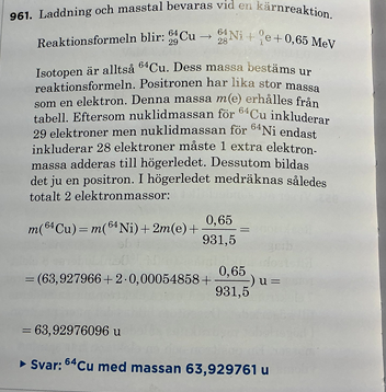 Det vill säga: kärnmassan hos koppar - 64 kan beräknas genom att addera kärnmassan hos nickel med positronens massa och den frigjorda energin.