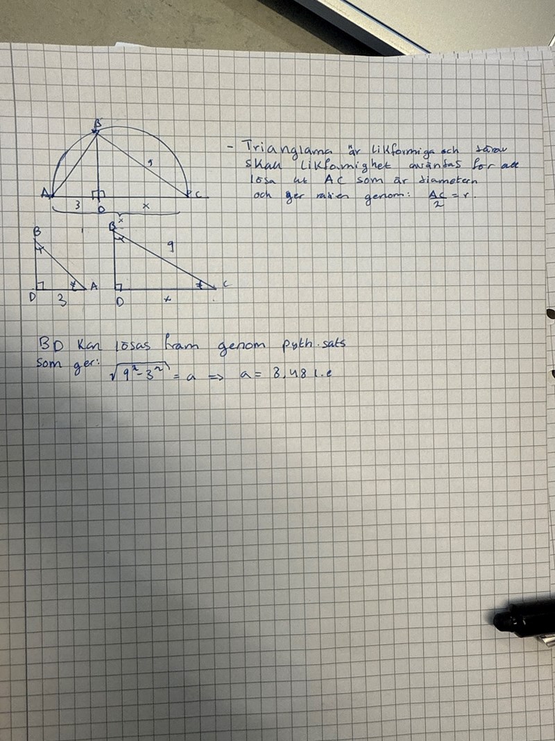 Jag har även löst ut ena kateten via pyth sats men vet inte om det är relevant?