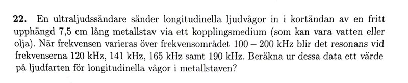 Säg grundtonen är 23 kHz, våglängden 15 cm, och då får du typ samma hastighet som facit.Hur vet du att det är 23 khz mellan resonanserna smat vilka ordningsnummer det rör sig om?