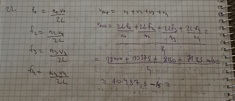 Såhär gjorde jag ,men facit fick det till 3.56*10^3 m/s. Jag vet att det är svårt att anta vad ordningsnummer kan vara då vi inte vet hur stor ljudfart det är för varje frekvens,men hur gör man annars ?