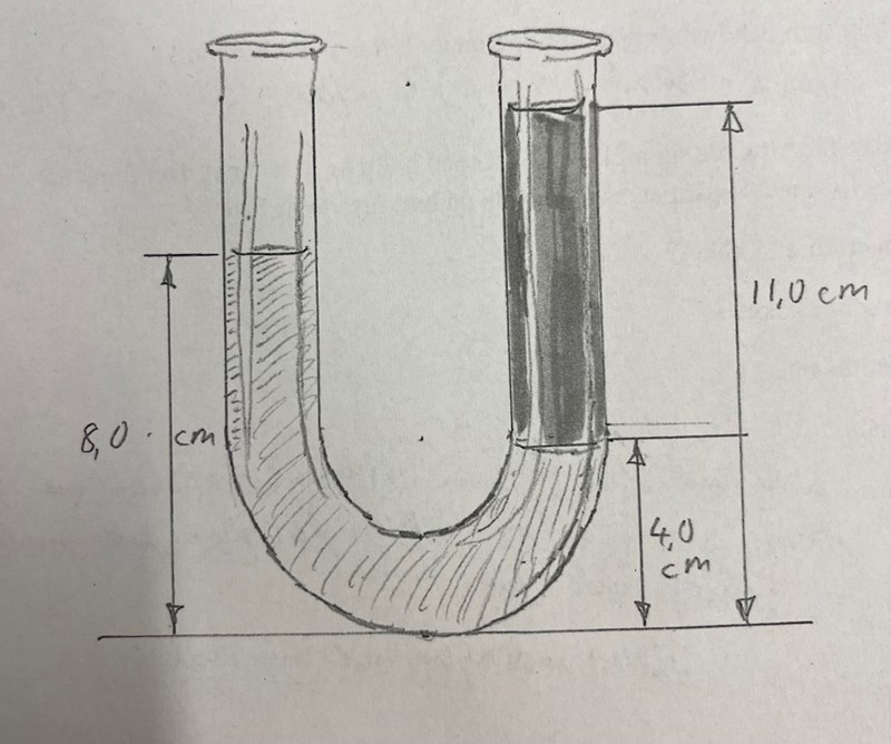Ture skrev:Dra ett horisontellt streck, 4 cm över u-rörets botten. Dvs vid skiljelinjen mellan vatten och den okända vätskan.