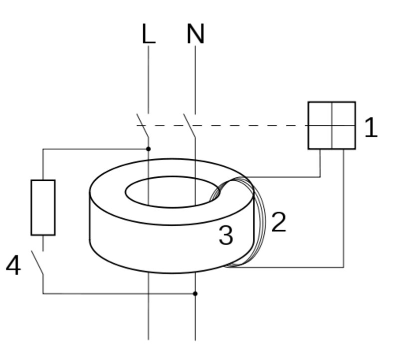 När allt är OK har strömmen i N-ledaren och L-ledaren motsatt riktning. Den inducerade spänningen från resp. ledare tar då ut varandra och ingen spänning kan registreras över spolen "2".