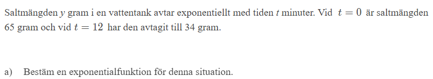 Jag började med att skriva formeln för en exponentialfunktion y=c*ax. Jag la in 65 i C eftersom den korsar y-axeln vid 65 när x=0. Men nu vet jag inte hur jag ska forsätta.