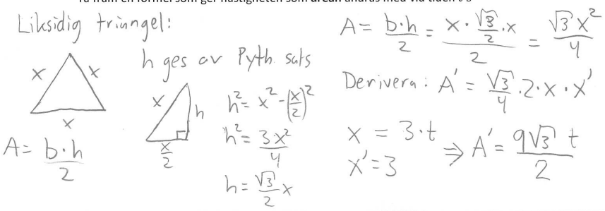Sidan hos en liksidig triangel växer med den konstanta hastigheten 3 𝑐𝑚/𝑠. Ta fram en formel som ger hastigheten som arean ändras med vid tiden 𝑡.