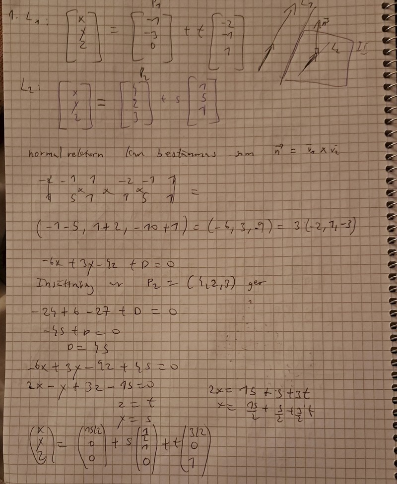 hm detta är facits svar. Men jag fick inte som dem som sagt och jag förklarar detta i #1. I bilden nedan kan ni se hur jag gått tillväga för att hitta planets ekvation på parameterform. Varför kan man inte ta kryssprodukten mellan linjernas riktningsvektorerna för att få normalvektor till planet?