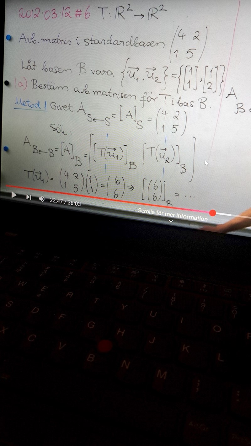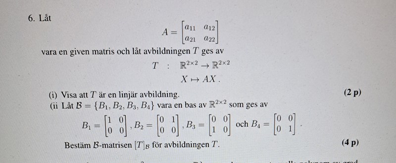 Jag körde fast på 6b) och försökte sätta B1=A*B1 för att lösa ut A matrisen då de har definierat åt oss hur avbildningen T ser ut. Men B1 är inte ens inverterbar så det blev bara fel. Jag vet att vi är ute efter matrisen för avbildningen T i basen B. Hur ska man närma sig uppgiften?