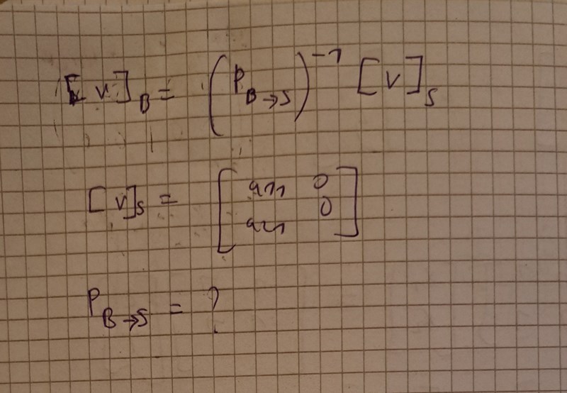 Vi behöver bestämma matrisen i basen B precis som jag nämnde i #5. Vi har [v]s men vad är PB=>S i vårt fall?