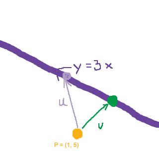 Den gröna punkten, Q, är den punkt på linjen som ligger närmast P. Du har som sagt hittat en vektor u, som går mellan P och en känd punkt på linjen y = 3x. Nu vill du projicera denna vektor u på en vektor parallell med linjen. Vilken vektor skulle du kunna ta? :)