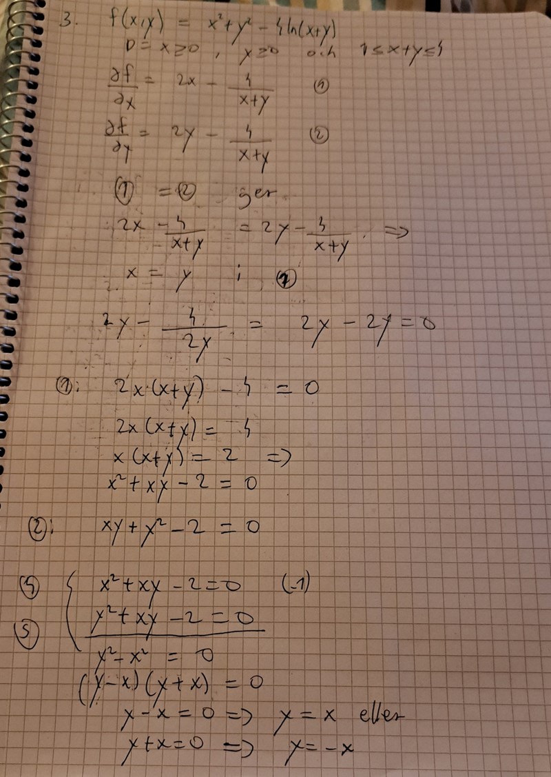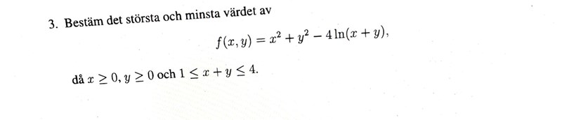 Jag försöker hitta partiella derivator genom att göra på det sättet jag gjort ibörjan och då får jag att 0=0. Vid andra sättet får jag antingen att y=x eller y=-x. Betyder det här att det inte existerar stationära punkter? Sen är jag inte klar med uppgiften riktigt då jag fastnat på hur jag ska fortsätta vidare. Jag vet att jag ska titta på randen och 1<=x+y<=4