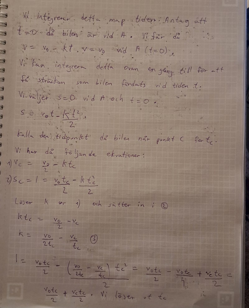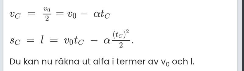 När t=0 vid A så har vi v=v_0 och då s=0 alfa=2v0/t. Men sen har vi också alfa=v_0-v/t_c där t_c är den tiden som man åker från A till C. Nu vill vi göra oss av med t_c