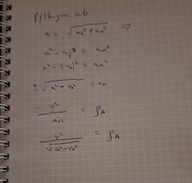 Jag använder pythagoras sats a^2=a_t^2+a_n^2 där jag känner till a_t i form av fartändringen v0 till v0/2 och då kan vi hitta a_n. Vi vet också ett uttryck för a_n =v^2/rho