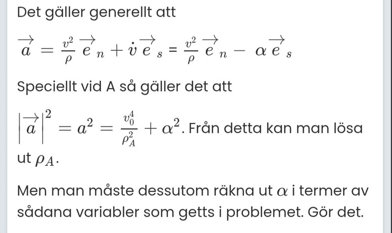 Okej jag förstår. Nu vet vi vad a_t är i alla fall samt beloppet av a. Vi vet också a=v^2/rho+alfa då alfa =v*. Vi behöver hitta alfa och v
