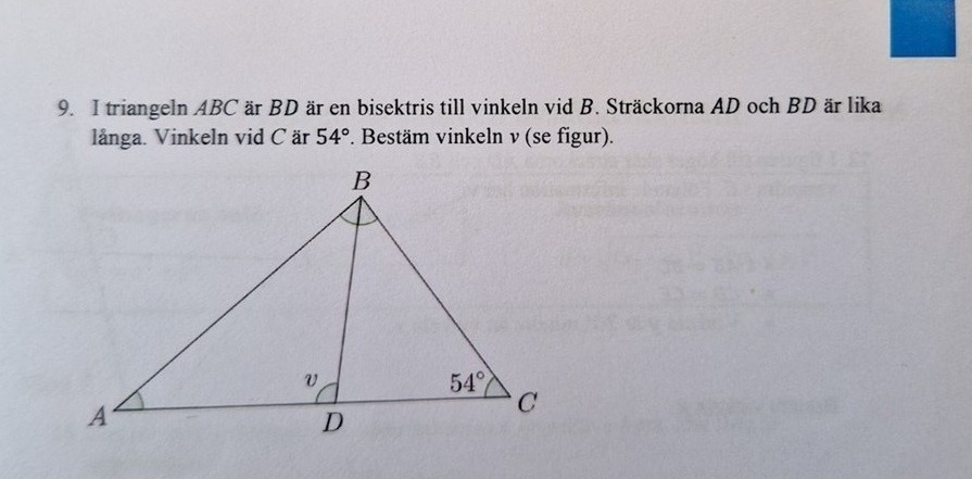 Att sedan AD är lika lång som BD innebär att ABD är en likbent triangel. För en sådan gäller att basvinklarna är lika stora. I ditt fall innebär det att u = w.