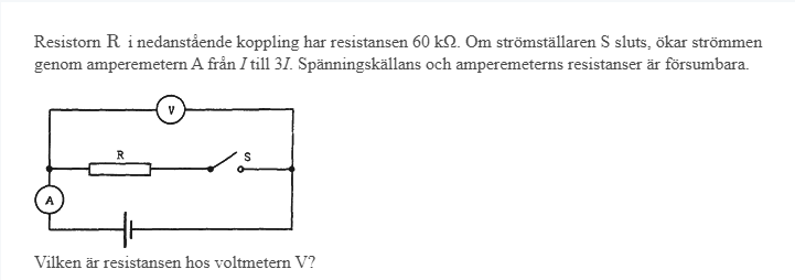 Vart kan jag börja någonstans? Jag vet att då S inte är sluten går all ström genom voltmetern. Då S är sluten så blir strömmen 3 gånger större, alltså måste den totala resistansen vara 3 gånger mindre. Men facit säger att spänningen (U) = 60kΩ⋅2I. Hur då?