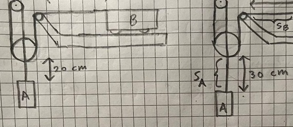Jag tänker att linlängden mellan den översta trissan och den stora trissan är 2SA, och att linlängden mellan B och trissan närmast B är SB, Jag förstår dock inte hur jag ska uttrycka linlängden mellan trissan närmast B och den stora trissan?