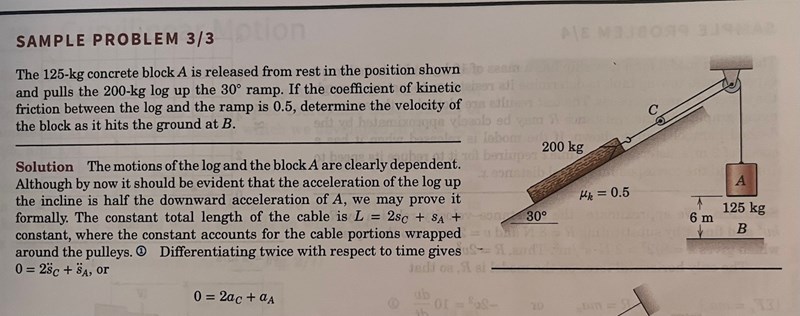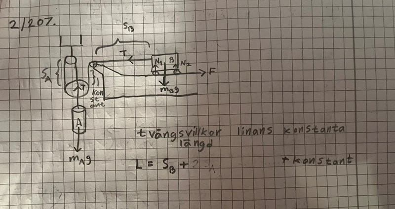 Jag har ett lite liknande exempel i kursboken och försöker typ härma det. Jag kallar sträckan mellan B och första taljen för SB sträckan mellan taljan högst upp och den stora taljan för SA. Men det är väl konstant? Den kanske man bara kan baka ihop i en konstant?