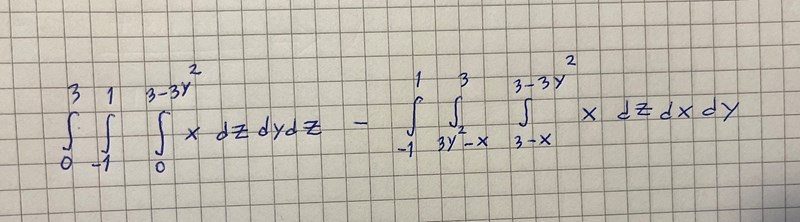 Kan jag tänka att jag först beräknar trippelintegralen med xy-planet som "golv" och den paraboliska cylindern som "tak" och sedan subtraherar trippelintegralen med planet x =3-z som "golv" och den paraboliska cylindern som "tak" från det?