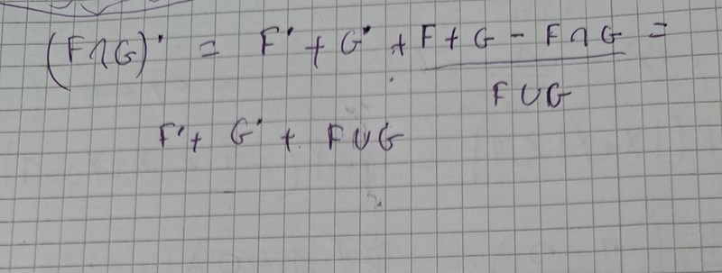 Rita en rektangel. I rektangeln ritar du två cirklar som överlappar lite. Ena cirkeln är F, andra är G. F snitt G är överlappat mellan cirklarna, (FsnittG)* är alltså allting (hela rektangeln) förutom överlappet. Fundera sedan på vad F* snitt G* blir, det borde bli samma. Gör likadant för de andra grejerna du funderade på