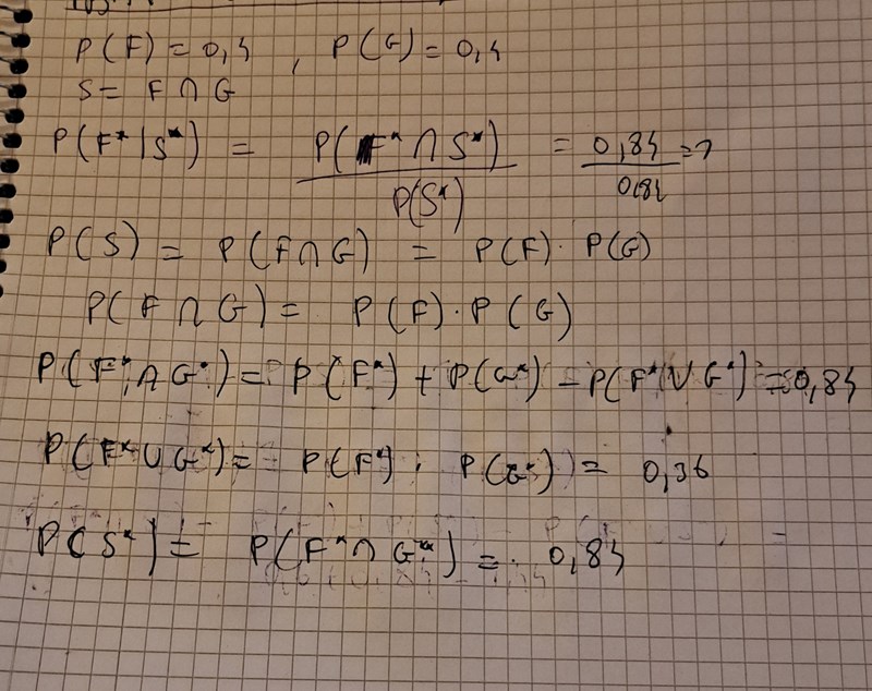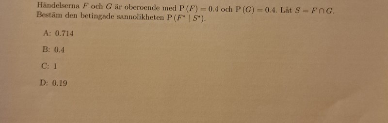 2) jag undrar samma sak gällande nämnaren för vi går från P(FsnittG)*till P(F*UG*).