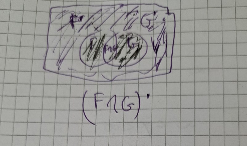 Det där fick jag det till.F*ochG*är komplementet. Sen gjorde jag som du sa gällande (FsnittG)*. Sen om man tittar på venndiagram så inser man att det blir lika med detta.