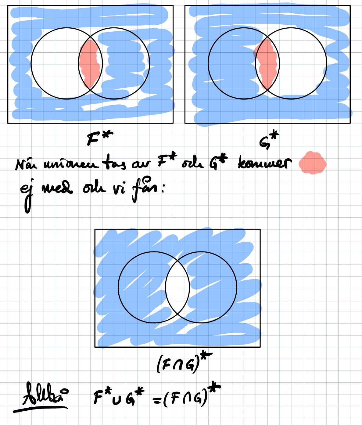 Hondel skrev:Rita en rektangel. I rektangeln ritar du två cirklar som överlappar lite. Ena cirkeln är F, andra är G. F snitt G är överlappat mellan cirklarna, (FsnittG)* är alltså allting (hela rektangeln) förutom överlappet. Fundera sedan på vad F* snitt G* blir, det borde bli samma. Gör likadant för de andra grejerna du funderade på