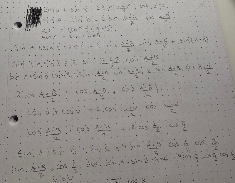 Jag ska visa att Sin A + Sin B + Sin C = 4 Cos A/ 2 x Cos B/2 x Cos C/2.
